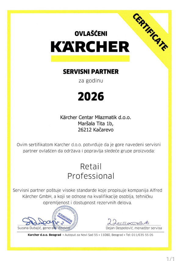Servis se vrši isključivo ugradnjom originalnih Karcher delova jer je to garancija dugovečnosti i kvaliteta.